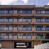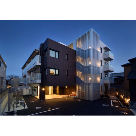傾斜のある土地を利用して1階と2階それぞれに用途を分けた入り口を作りました。駅と同じレベルにある2階には独立した店舗スペースを作りました。マンションの出入口は1階にあり、一般の人と導線を分ける配慮をしました。国道側、温か味のある暖色系タイル貼としました。
