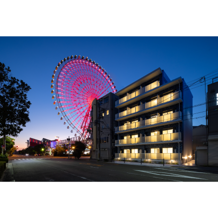 会社の100周年事業として、社員寮を本社の近くに建設されました。入居者様以外も自由に利用いただける建物になっていて、1階にフィットネスジムスペース・2階には大きなキッチンスペースや、屋上には海遊館の観覧車を眺めながらバーベキューを楽しんで頂ける屋上ガーデンなどイベントスペースが充実した施設になっています。