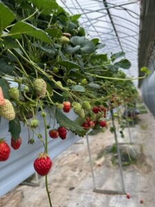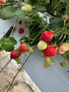 原田いちごファームさんは、高設養液土耕栽培でいちごを栽培されていて、屈むことなく立ったままでいちご狩りを楽しむことが出来るので、とても楽でした。