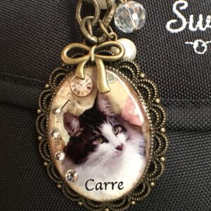 1回目うちの子記念日。Carreくんは巣穴カドラー、私はキャリーバッグに付ける写真入りバッグチャームを記念品とした。  💗
