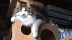 (キャットタワー最上階からドーーーン。ただいまの体重は5.82キロ)