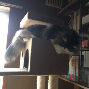 1階から2階へ階段を一気に駆け上がり、スピードに乗ったままバタバタと廊下を急カーブ(横Gはどうなってる??)で部屋へ突進。部屋の窓際に置いてあるキャットタワーまでドタバタ走りきって爪とぎをする‼