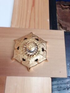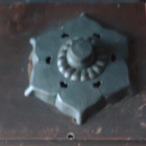 こちらの装飾は釘隠しといい、釘の頭を隠す為に用いられていて、この穴のハートの形を猪目だという