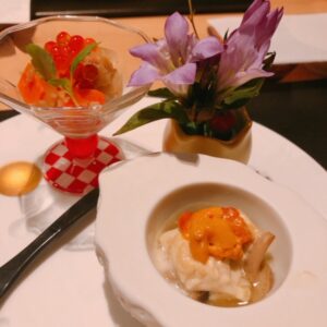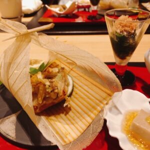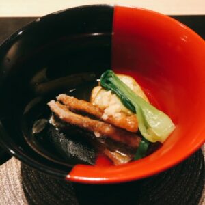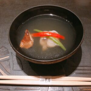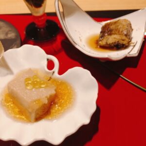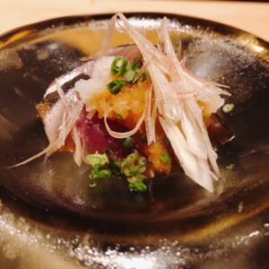 先付に秋鱧と松茸のお吸い物、戻り鰹のたたき