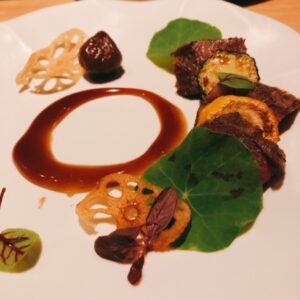 丸茄子と秋刀魚の餡かけ、黒毛和牛の炭焼き