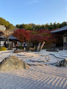 山門に入ると美しい枯山水のお庭が見えます。白砂を雲海に見立て、天空を自在に弄ぶ龍を石組で表しているそうです。