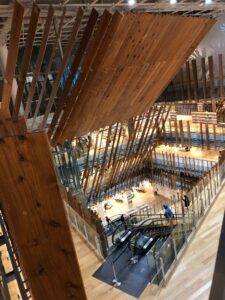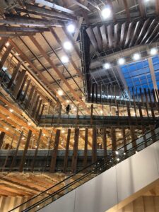 2階から6階まで斜めに開いた吹き抜け空間に富山県産材のルーバー(羽板)を使用したことで、
